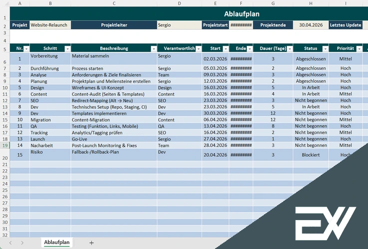 In unseren verschiedenen Excel-Vorlagen findest du auch diese Variante für einen klaren Projektablauf. Sie passt gut, wenn du Verantwortliche, Schritte und Zeitfenster kompakt festhalten und sauber nachvollziehen möchtest.