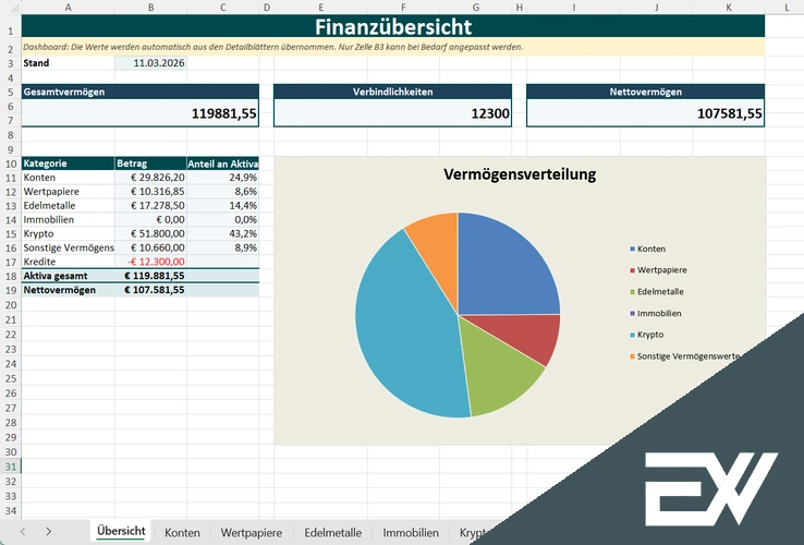 Wir bieten dir mehrere Finanzübersicht Excel Vorlagen an, und diese Version ist ideal, wenn du Vermögen, Schulden und Verteilung in einem klaren Dashboard sehen möchtest. Kategorien wie Konten, Wertpapiere, Edelmetalle, Immobilien und Krypto werden sauber getrennt und direkt als aussagekräftiges Diagramm dargestellt.