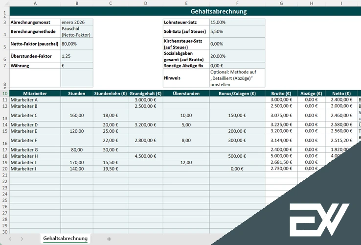 Öffne zuerst die Vorlage „Gehaltsabrechnung Excel Vorlage“ und trage oben den Abrechnungsmonat, die Berechnungsmethode, die Währung und die wichtigsten Sätze ein. Danach ergänzt du unten die Mitarbeitenden mit Stunden, Grundgehalt, Überstunden und möglichen Bonuszahlungen.