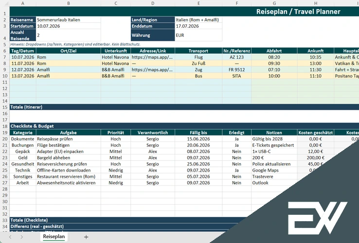 Diese Vorlage ergänzt unsere Reiseplan Excel Vorlagen um Budget-, Checklisten- und Aufgabenbereiche für die Vorbereitung. Besonders praktisch, wenn du Kosten und To-dos vor der Abreise gesammelt abhaken willst.