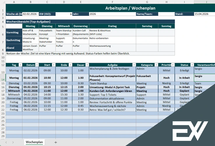 Wenn du den Plan regelmäßig nutzt, speicherst du dir einfach jede Woche eine neue Kopie und passt nur die Inhalte an. So behältst du Meetings, offene Punkte und wichtige Aufgaben sauber im Griff, ohne jedes Mal wieder neu anfangen zu müssen.