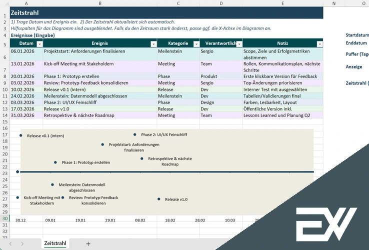 Eine unserer Zeitstrahl Excel Vorlagen, wenn du Termine, Ereignisse und Zuständigkeiten in einer Datei bündeln willst. Du bekommst einen klaren Projektverlauf und kannst neue Schritte jederzeit schnell ergänzen.